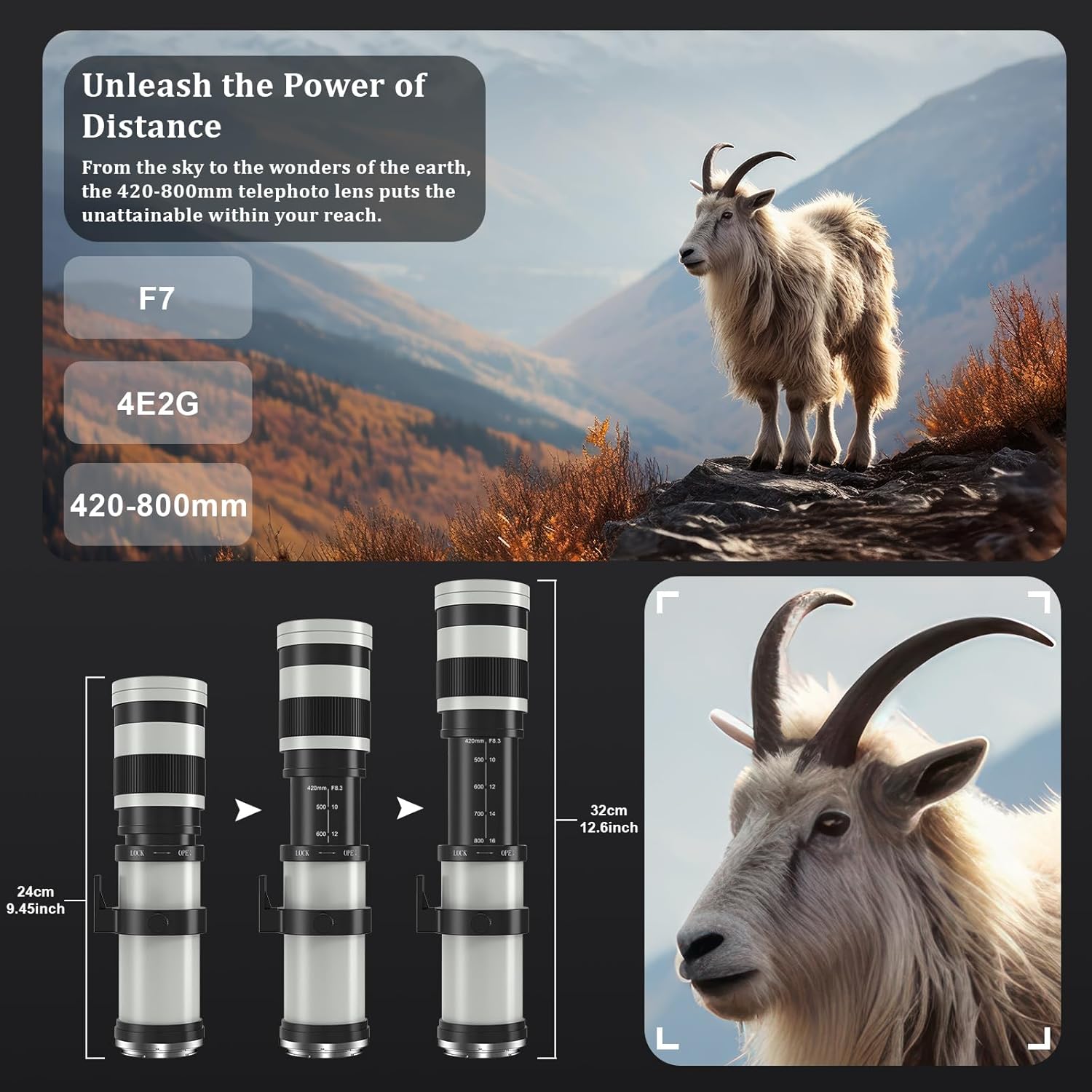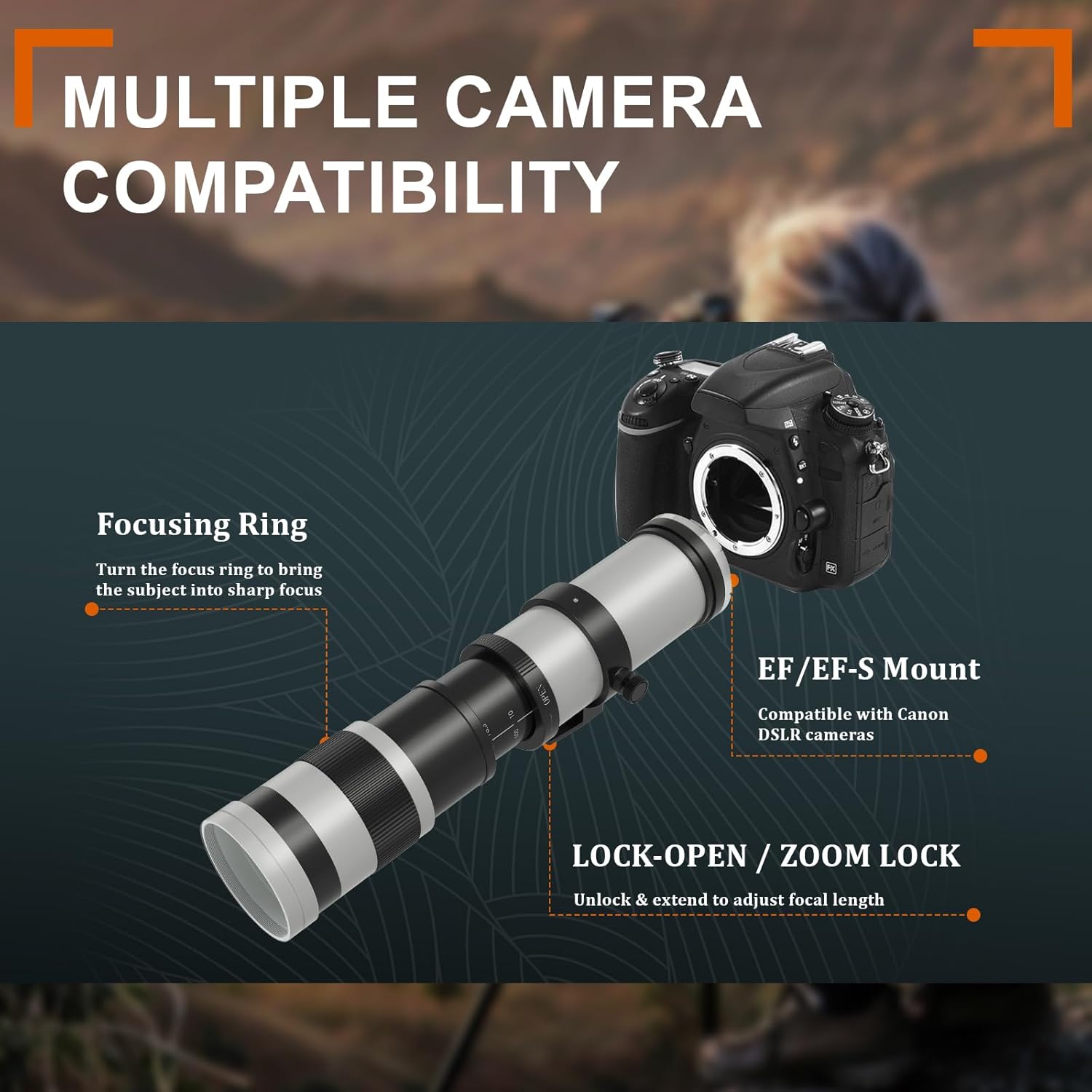 Capture stunning long-range shots with the 420-800mm Telephoto Lens for Canon. This EF lens is compatible with a wide range of Canon DSLR cameras, including the Rebel series, T8i, T7i, T7, T6, 4000D, 1500D, 90D, 80D, 77D, 70D, 60D, 7D, 6D, 5D, and 1D models. The manual focus MF zoom lens allows for precise control over your shots, ensuring sharp and detailed images every time. Whether you’re shooting wildlife, sports, or landscapes, this telephoto lens will help you get the perfect shot. Upgrade your photography gear with the 420-800mm Telephoto Lens for Canon today.