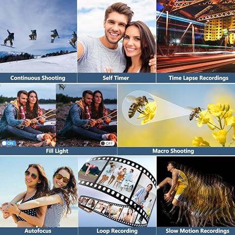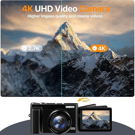 【Multifunctional Point and Shoot Digital Cameras】The 4k digital camera for photography is multifunctional in that it has four photo modes(Continuous shooting/Timed shooting/Auto photo mode/Normal photo mode)and four video modes(Time lapse recording/Loop recording/Slow motion recording/Normal video mode), along with a variety of filters. One camera can fulfill all your photography needs